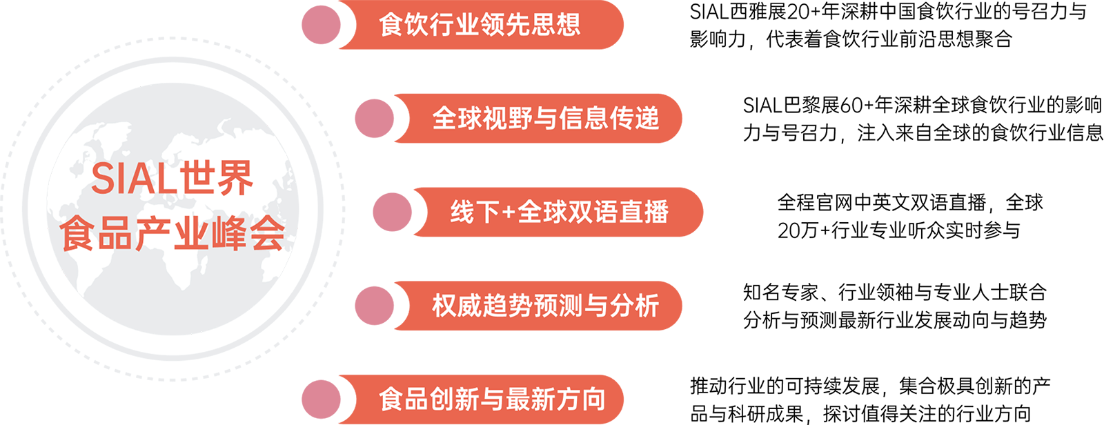 SIAL世界食品產業(yè)峰會旨在傳遞食飲行業(yè)前沿資訊,剖析行業(yè)發(fā)展新趨勢。圍繞食飲行業(yè)熱門話題及品類,SIAL世界食品產業(yè)峰會將邀請全球頂尖專家學者參與并發(fā)表主題演講,參會人士也有機會就行業(yè)熱門議題進行深入探討,助力食飲企業(yè)獲得更多高價值合作商機和行業(yè)信息。