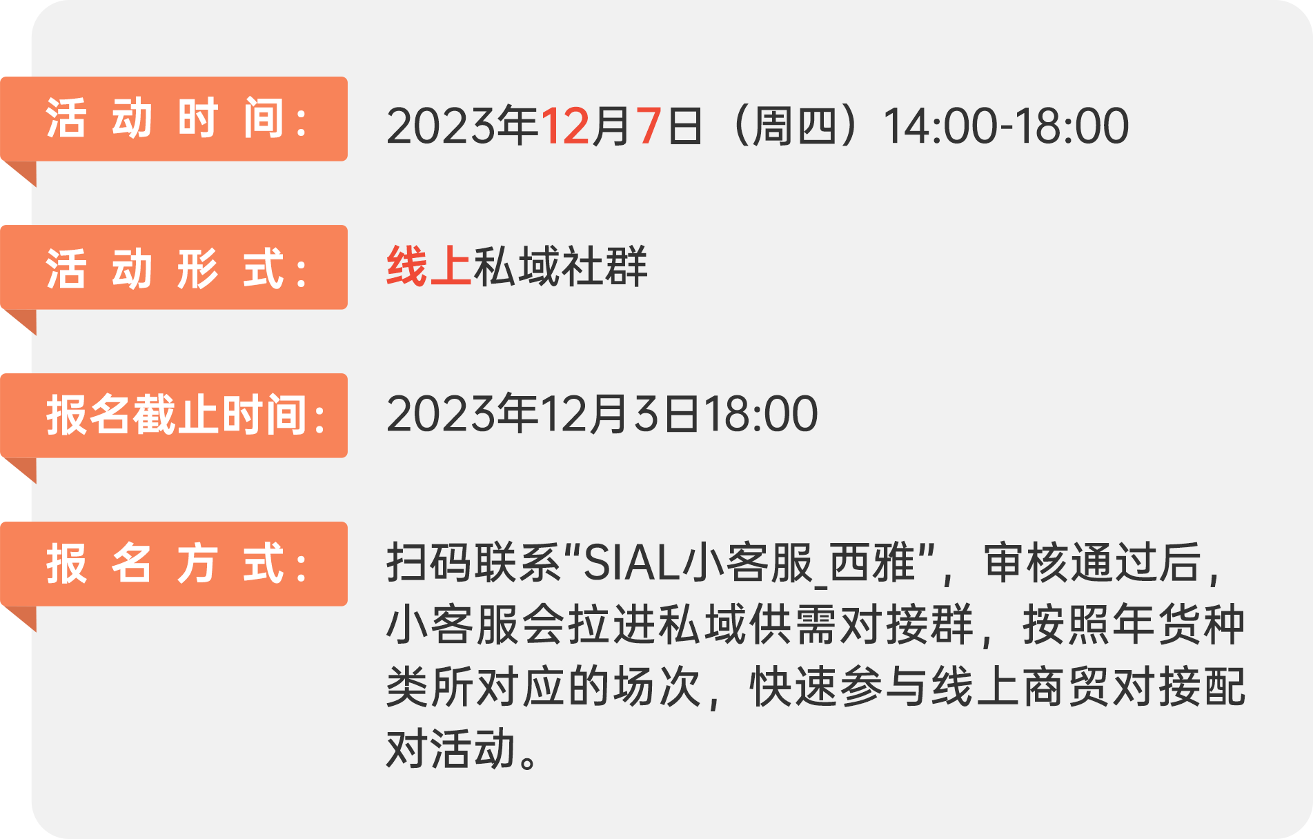 | 為了助力品牌商、經(jīng)銷商、商超等食飲全產(chǎn)業(yè)鏈打好年底最后也是最硬一場“戰(zhàn)役”,SIAL西雅國際食品展將于12月7日再次發(fā)起線上供需對接活動“SIAL西雅展秋冬食飲采購節(jié)”,以私域流量為食飲行業(yè)供需雙方實現(xiàn)年底完美收官再添助力。 |