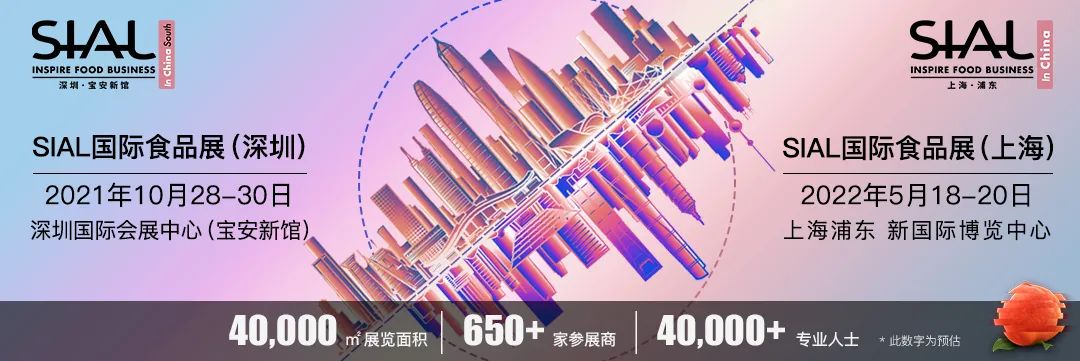 SIAL國際食品展(深圳)將于2021年10月28-30日在深圳寶安新館舉辦,展會規(guī)模將達(dá)到4萬平米,展商數(shù)量將達(dá)到650+,專業(yè)人士將達(dá)到40,000+。