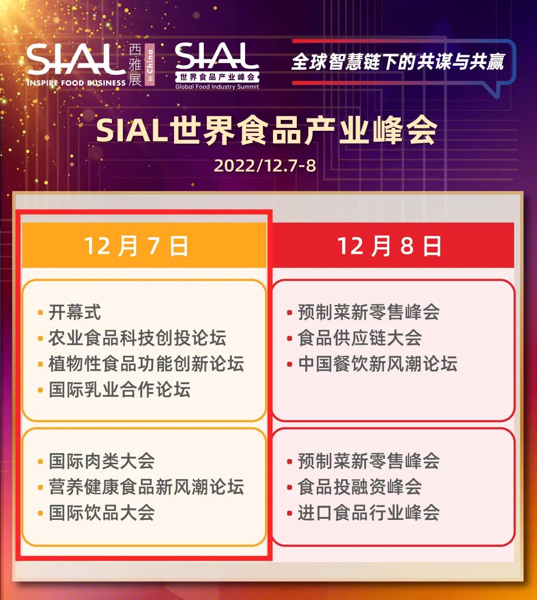 SIAL世界食品產(chǎn)業(yè)峰會(huì)將于2022年12月7日-8日正式舉辦!峰會(huì)將以“全球智慧鏈下的共謀與共贏”為主題舉辦包括預(yù)制菜、供應(yīng)鏈、農(nóng)業(yè)食品科技、乳業(yè)、肉類、飲品、食品投融資、營養(yǎng)健康食品、中餐、植物性食品、進(jìn)口食品在內(nèi)的11場主題論壇。