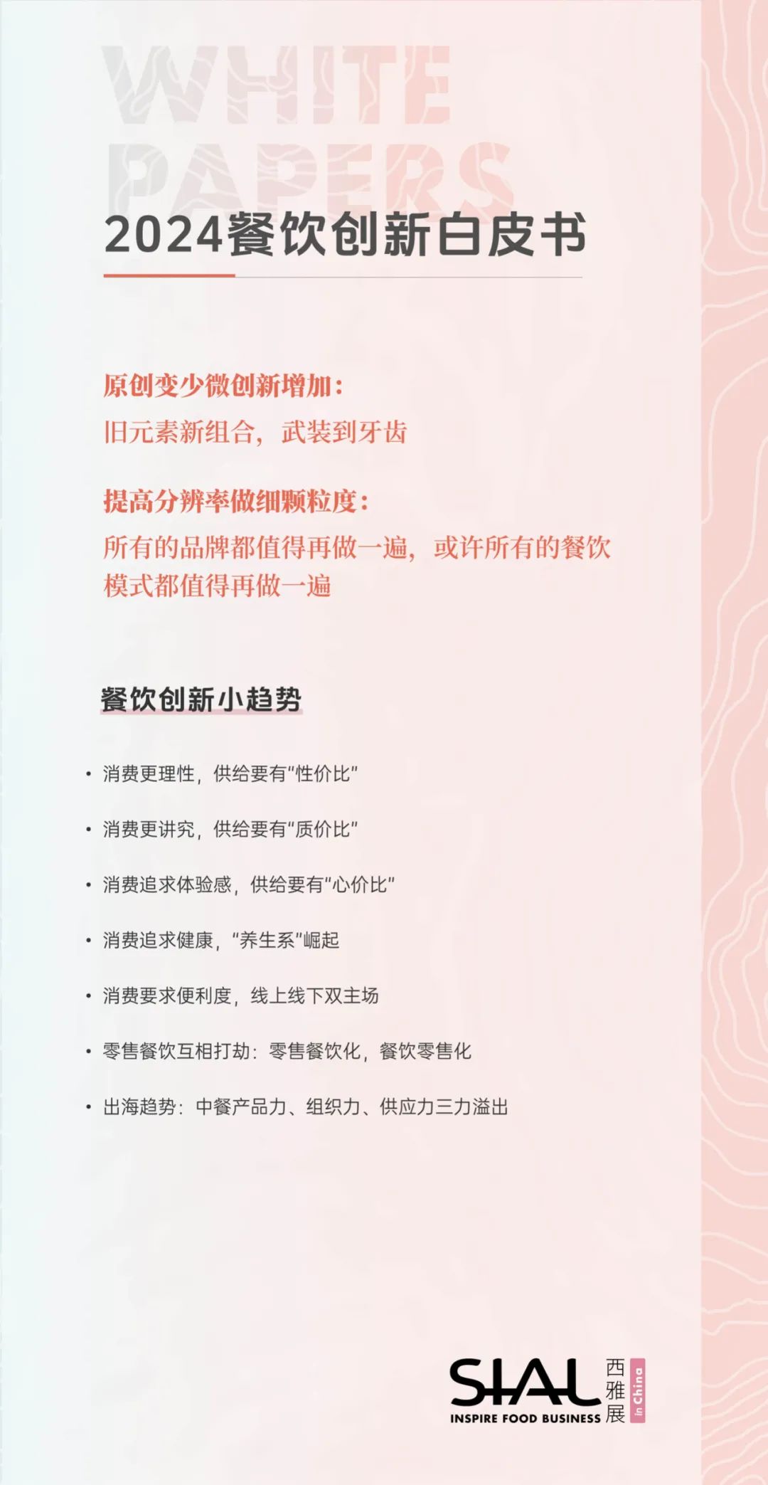 同時(shí),SIAL西雅展每年發(fā)布的食飲白皮書(shū),也是企業(yè)了解行業(yè)趨勢(shì)、市場(chǎng)變化的重要工具。在定期將市場(chǎng)、周期、區(qū)域、人群、品類等各個(gè)維度的信息進(jìn)行整合后,SIAL系列白皮書(shū)通過(guò)多年深耕一線的經(jīng)驗(yàn)以及深厚的專家資源,對(duì)行業(yè)發(fā)展進(jìn)行研判,幫助企業(yè)迭代認(rèn)知。無(wú)論是新企業(yè)入場(chǎng)還是老企業(yè)破局,都能在SIAL西雅展這個(gè)平臺(tái)上獲得增益。此外,以SIAL創(chuàng)新大賽為代表的系列國(guó)際食飲賽事,鼓勵(lì)企業(yè)突破傳統(tǒng),推陳出新,并依托SIAL全球系列食品展提供國(guó)際平臺(tái)進(jìn)行新品首發(fā)、品牌推廣,極大增強(qiáng)了企業(yè)的世界影響力。