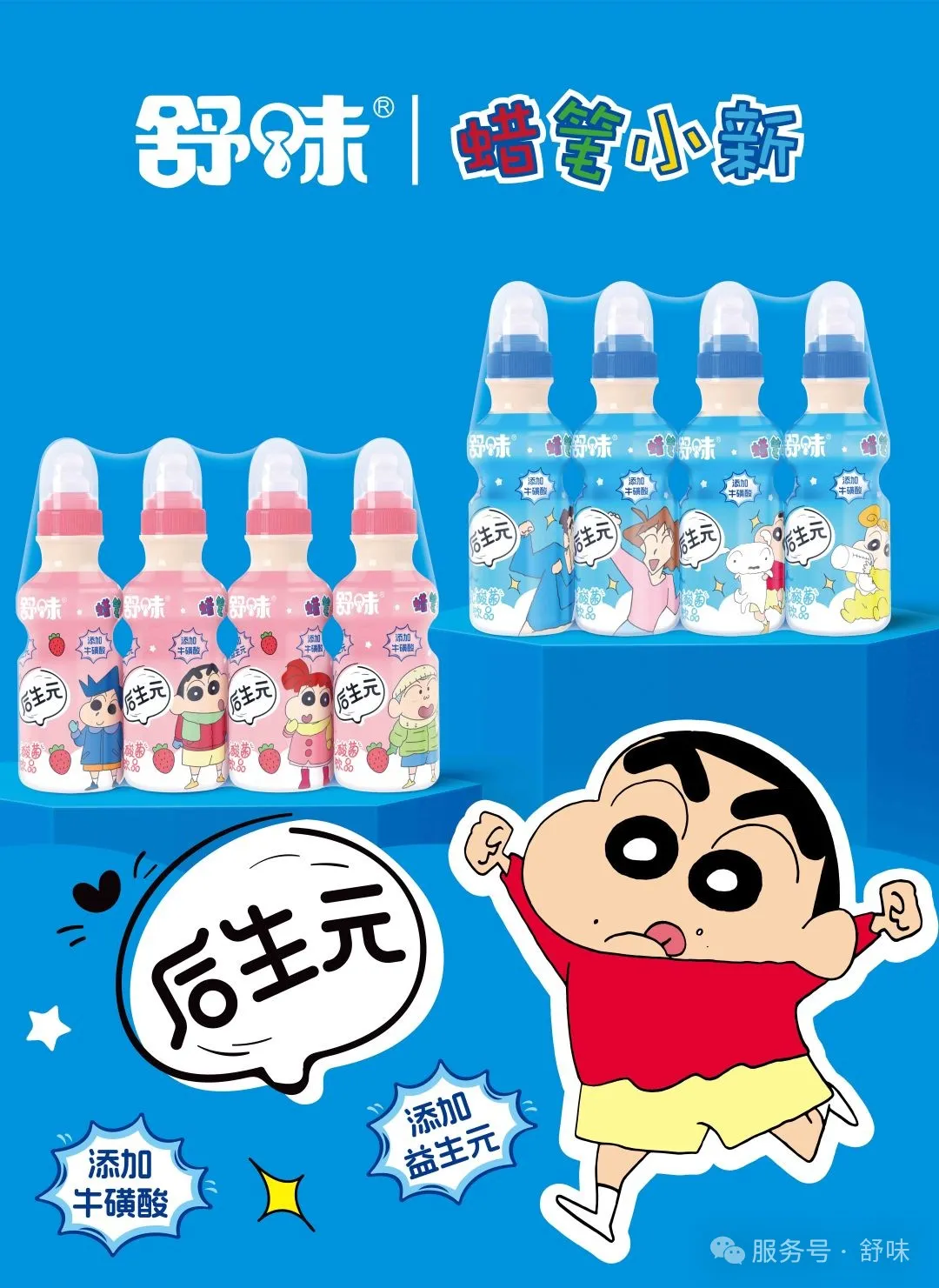 產(chǎn)品亮點:聯(lián)合活潑可愛的蠟筆小新形象推出的舒味乳酸菌,添加牛磺酸、益生元,自然發(fā)酵,純正好味,0脂健康,適合朋友小聚時來一瓶。