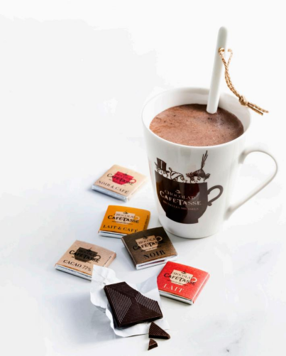 作為咖啡打造的巧克力品牌,Café-tasse加菲特使的商標圖案就是一杯熱氣騰騰的咖啡。