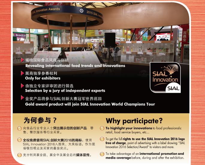 2016年1月開始,您可免費注冊您的創(chuàng)新大賽的參賽產(chǎn)品。請使用您的用戶名和密碼登陸展商中心,點擊SIAL創(chuàng)新大賽專區(qū)。